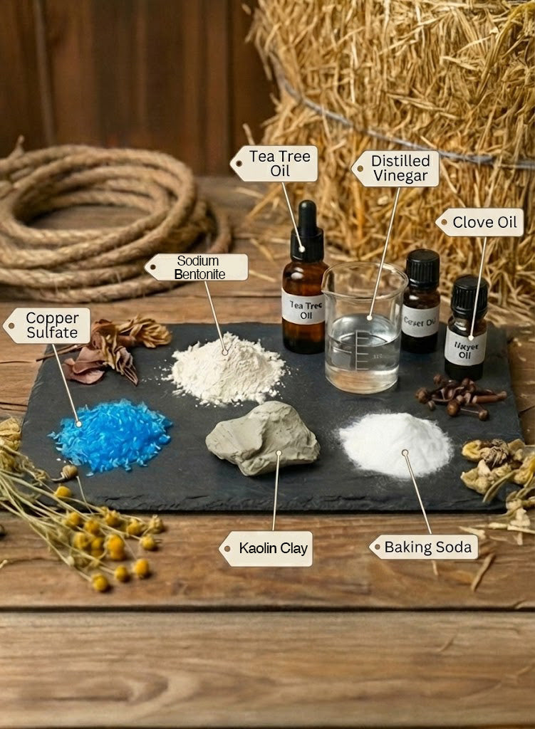 Copper Sulfate, Kaolin Clay, Sodium Bentonite, Baking Soda, Distilled Vinegar, Tea Tree Oil, Clove Oil.